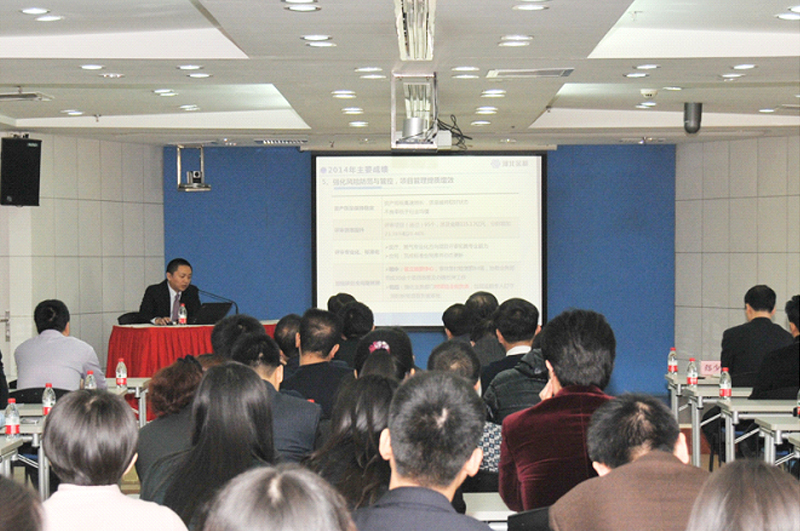 張總裁在會議上做了2014年年度工作報告及2015年工作安排,全面客觀地回顧了一年來公司各項工作進展情況,發(fā)現(xiàn)問題,總結(jié)得失,并根據(jù)戰(zhàn)略規(guī)劃部署了新一年重點工作任務。2014年是公司進行戰(zhàn)略轉(zhuǎn)型的第一年,在“抓住機遇、提質(zhì)增效”的指導思想下,圍繞抓好融資結(jié)構(gòu)升級和風控手段創(chuàng)新兩個著力點,加快干部隊伍建設(shè)梯隊化和年輕化步伐,構(gòu)建了“業(yè)務行業(yè)化、融資多元化、風控專業(yè)化”的經(jīng)營新格局。