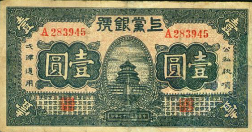1938年,為了獨立自主地發(fā)展和鞏固根據(jù)地,嚴(yán)防蔣介石、閻錫山經(jīng)濟封鎖,晉東南抗日根據(jù)地在沁縣成立上黨銀號,發(fā)行“上黨票”。上黨票初發(fā)行時與法幣、晉鈔、銀元以及根據(jù)地各縣銀號發(fā)行的縣票同時流通于晉東南、晉南、晉中、冀南等部分縣域,1938年發(fā)行的面額有拾元、伍元、貳元、壹元、伍角、貳角伍分、貳角、壹角等8種票面10種版別。壹元票的主圖設(shè)計為體現(xiàn)根據(jù)地貨幣特色,天壇主圖的下面倒印有一“黨”字暗記。1940年初,“上黨銀號”結(jié)束,其財產(chǎn)并入“冀南銀行”時,共發(fā)行上黨票300余萬元。