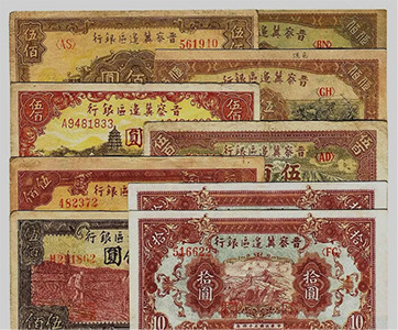 晉察冀抗日根據(jù)地,是中國共產(chǎn)黨在抗日戰(zhàn)爭時期于敵后開創(chuàng)的第一個抗日根據(jù)地。晉察冀邊區(qū)政府于1938年2月成立晉察冀邊區(qū)銀行,在山西五臺縣石咀鄉(xiāng)的普濟寺內(nèi)開始營業(yè)。邊區(qū)銀行的貨幣發(fā)行后,清除了地方發(fā)行的各種鈔票,統(tǒng)一了邊區(qū)的貨幣市場,支持了抗日戰(zhàn)爭,支持了生產(chǎn),改善了人民生活,深受抗日根據(jù)地軍民的歡迎。晉察冀邊區(qū)票當(dāng)時在山西、河北、察哈爾省、熱河省以及遼寧西部、內(nèi)蒙古、山東德州地區(qū)等敵后抗日根據(jù)地流通,流通人口達(dá)3000多萬人。直到1948年晉察冀邊區(qū)銀行與冀南銀行合并,成立華北銀行,晉察冀邊區(qū)票才停止流通使用。