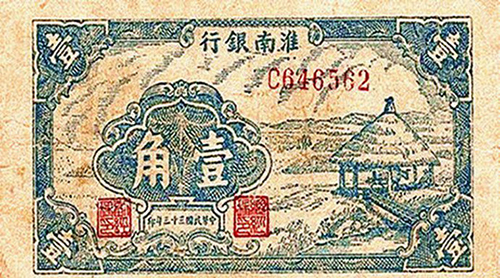淮南銀行1942年成立,行址設(shè)于江蘇淮安盱眙縣,發(fā)行淮南幣通行于淮南地區(qū)各縣。1945年8月與淮北地方銀號、江淮銀行、鹽阜銀行、淮海銀行4個地方銀行合并組成華中銀行。